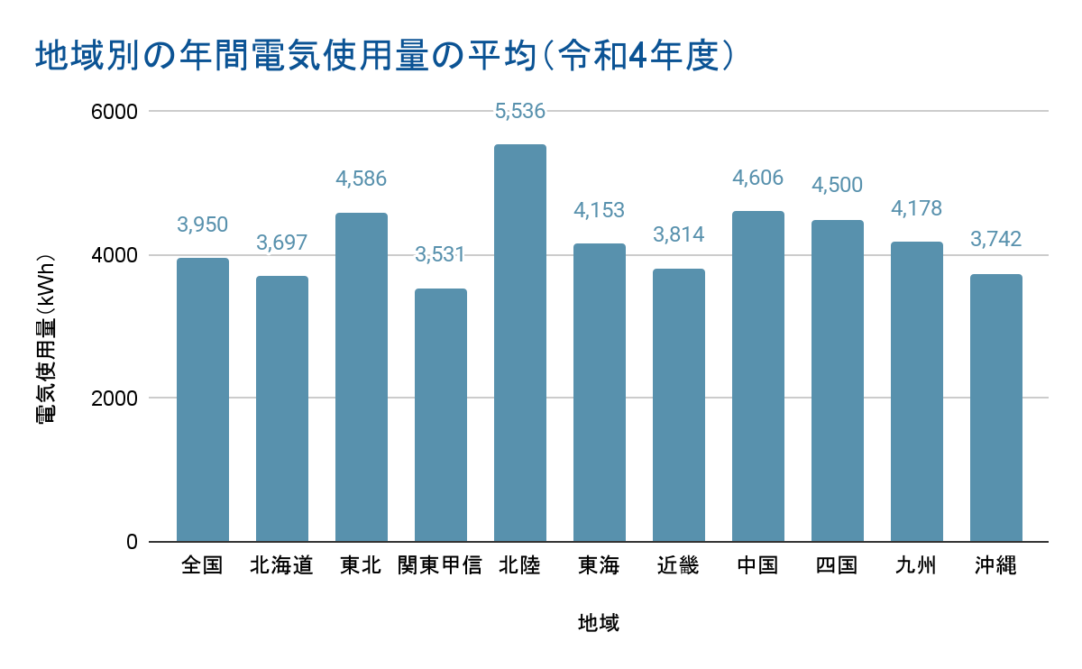 こうしてみると、もっとも電気使用量が大きいのは北陸地方であることがわかります。寒い地方では暖房の使用頻度が大きくなるため、電気使用量も多くなりがちです。