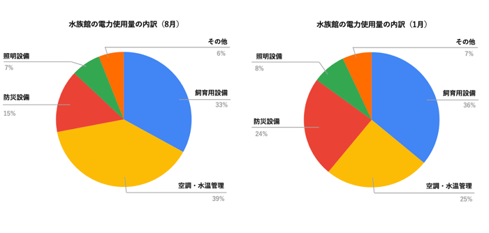 上図を見ると、8月は飼育管理の電力使用量の割合が最も高く、次に空調・水温管理の割合が高くなっている。一方1月は空調・水温管理の割合が最も多くなり、飼育管理の割合が次点で、季節によって内訳が変動しているのだ。